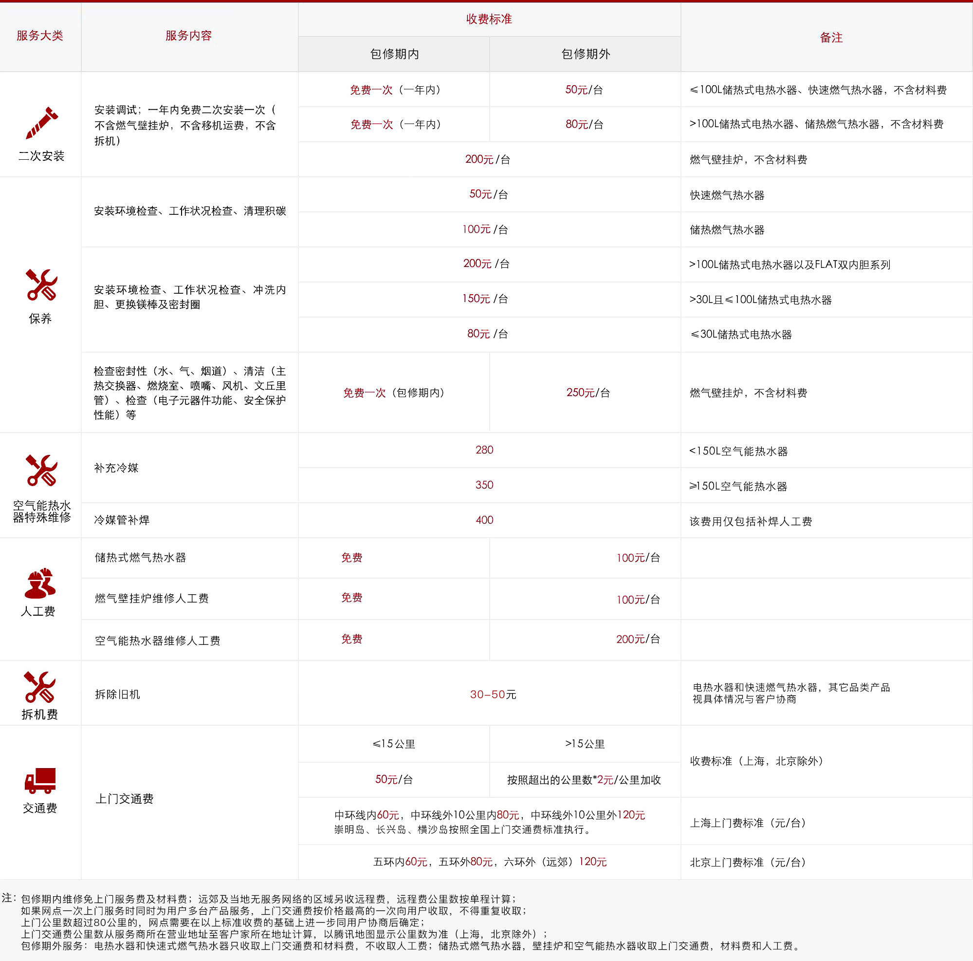 (一年內(nèi))50元/臺 ≤100L儲熱式電熱水器、快速燃?xì)鉄崴?,不含材料費 免費一次